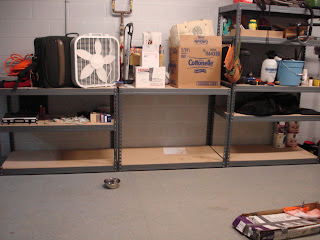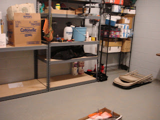 You can see that there is nothing on the floor that is either tempting or invaluable. Yes, apparently, it is necessary to put the garden hose up on top of the shelves and move the box fan off of the floor. The only issue with this whole ordeal is what to do with the rest of the stuff that wouldn't fit on a shelf. Enter phase II of the JP-ing: bring stuff inside.