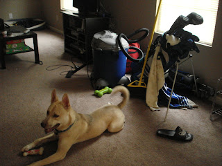 The only problem is that certain company we're hosting which requires limited stimulation also requires excessive observation. Like, she'll eat through wood and plastic. So we had to figure out what to do with her. We've got a garage (which I'm currently not allowed to park my jeep in becuase H needs to be able to "access his workspace") and it was decided that the garage was a suitable place for sweet girl Jemma, as long as we "Jemma-proofed" it.